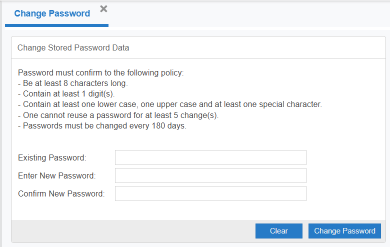 Use this page to change the Software Vulnerability Manager account password for the user that is currently logged in. The new password must contain a minimum of eight characters, or comply with the criteria defined in the Password Policy Configuration rules.