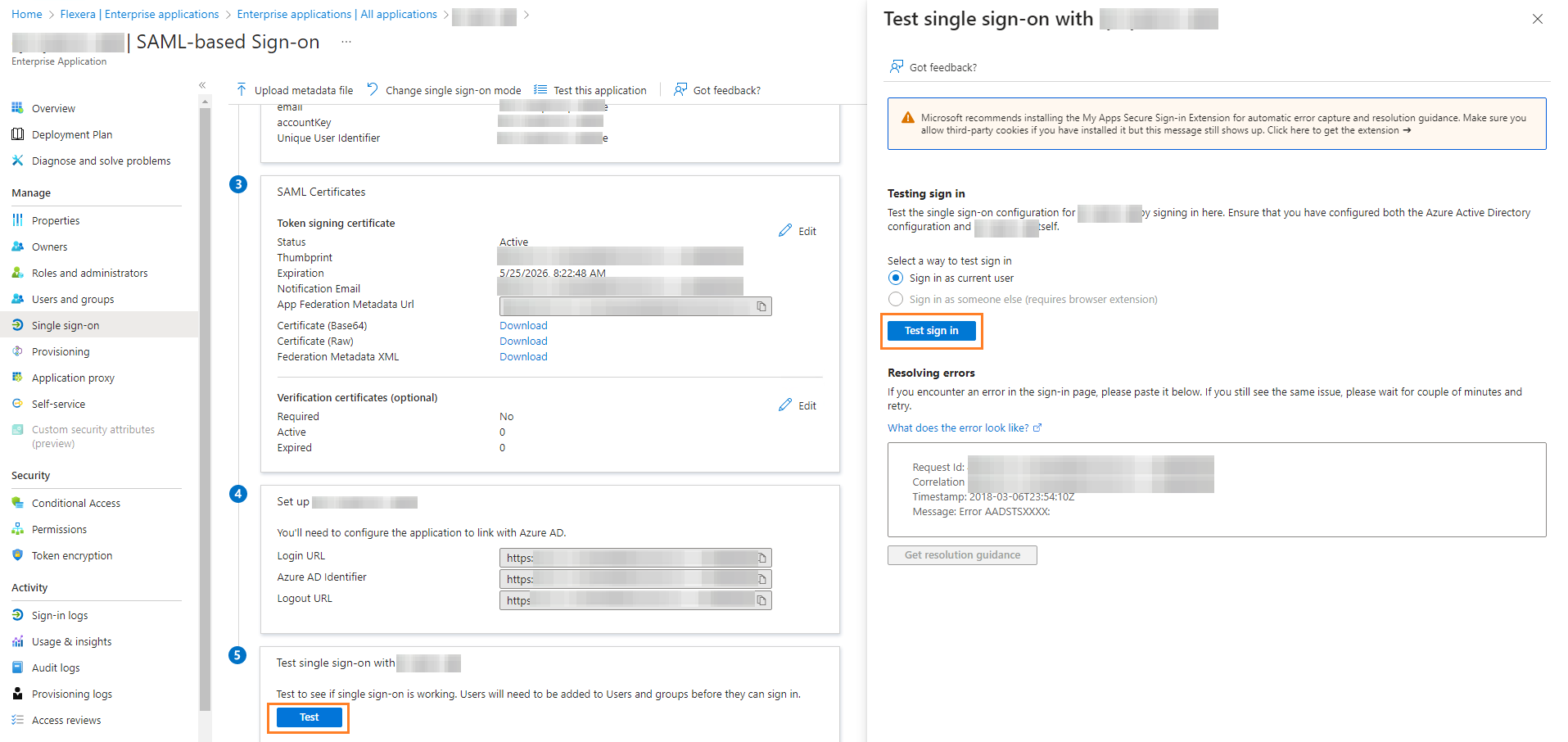 6. Click Test. The Test single sign-on appears on the right side. Click the Test Sign in button.