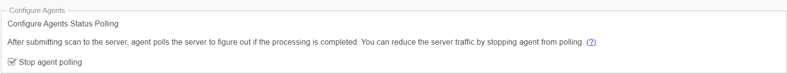 To address a server’s high CPU usage during high volume of scan data, agent polling has been switched off by default as agent polling is intended for debugging purposes only and is not needed for core functionality. You have the ability to turn agent polling ON or OFF.