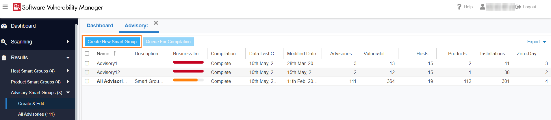 2. A list of created Advisory Smart Groups appears. To create a new Smart Group, click Create New Smart Group link.
