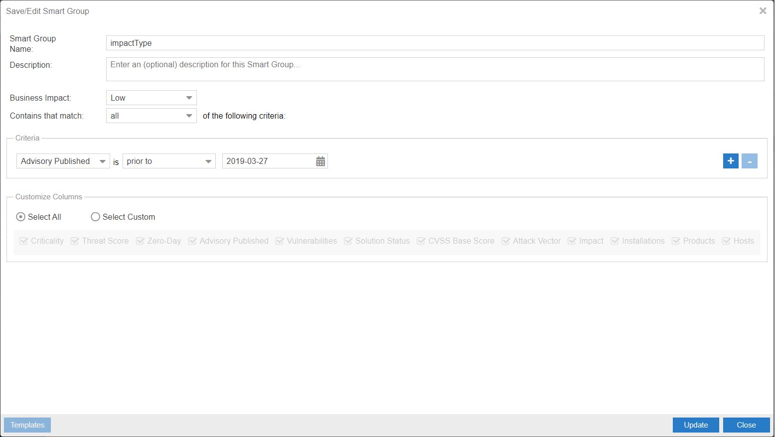 In the View/Edit Smart Group menu, you can filter results by date for the following criteria: Advisory Published, Last Scan Date, and Secunia Advisory ID (SAID) Creation Date. This filtering by date creates a list of all Advisories published on that date.