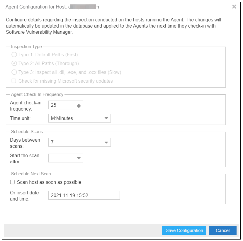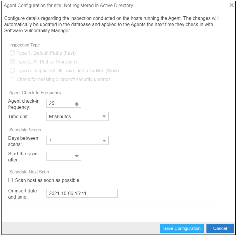 • The scan configuration settings set on the Software Vulnerability Manager website are not automatically transmitted to the agents. The agents have to connect to the Software Vulnerability Manager website as per their prior scheduled Agent Check-In Frequency before the agents become aware of the new scan configuration edits.