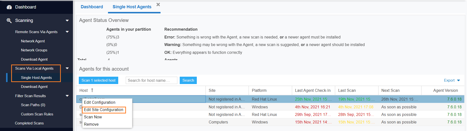 • Manage configurations and schedule scans for the hosts where the Agent is installed as a service in Single Host mode.